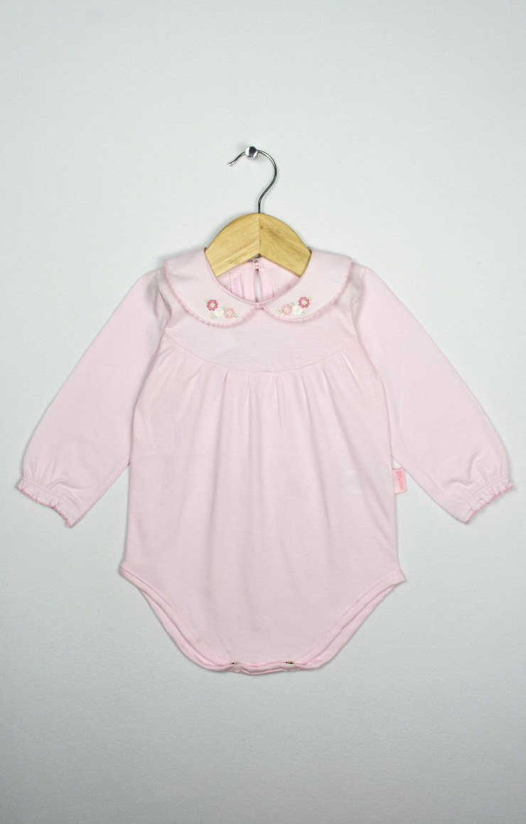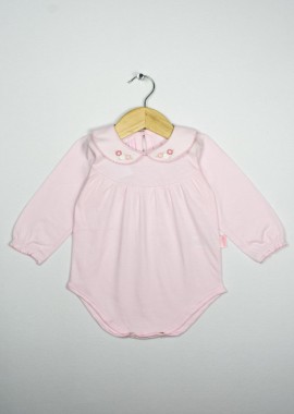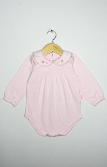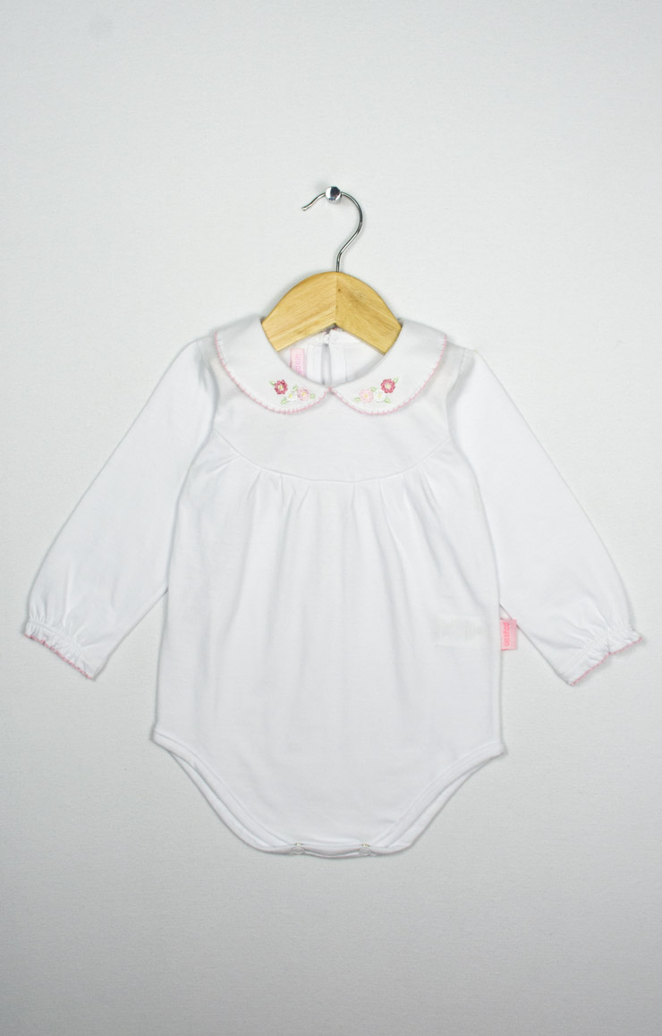 Body mangas largas con cuello baby bordado y terminación en picot. Jersey 100% algodón.