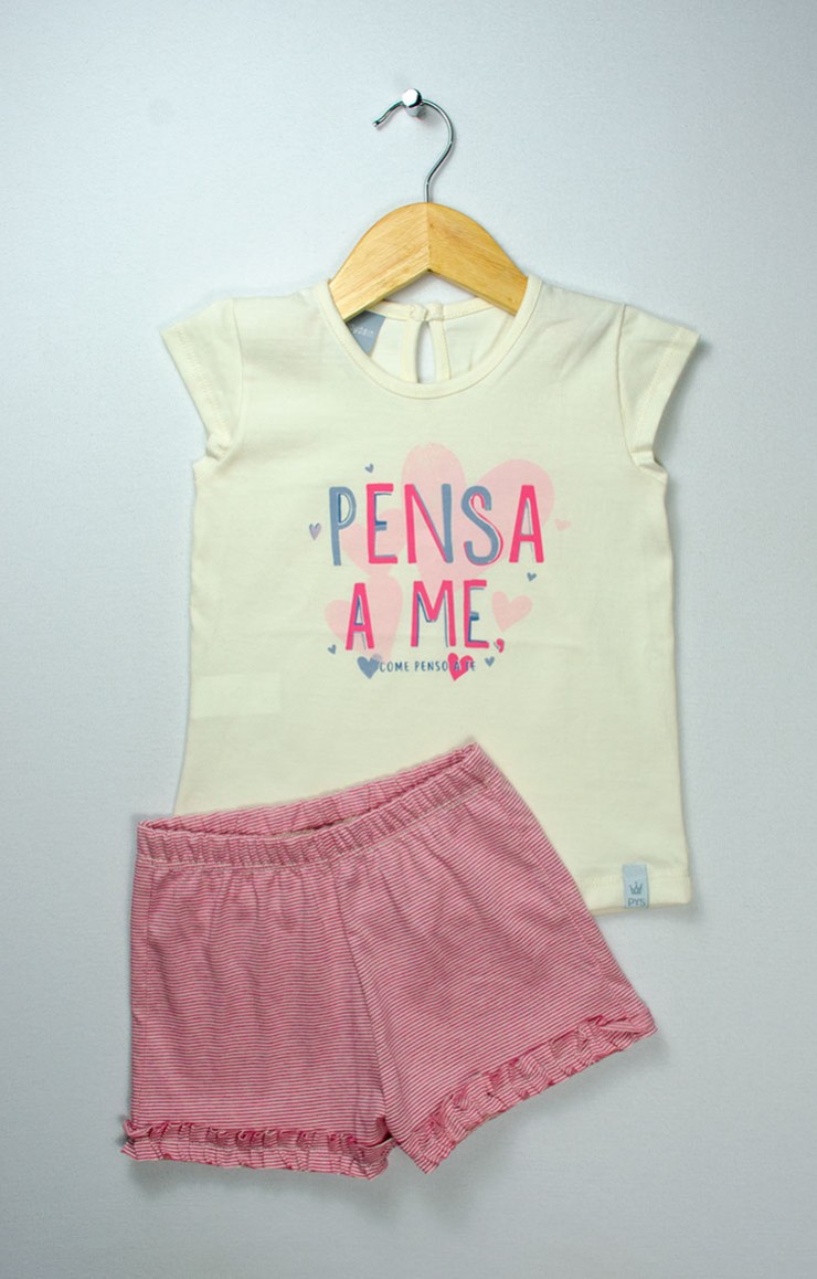 Pijama de jersey 100% algodón. Remera lisa con estampa y short rayado con volados.