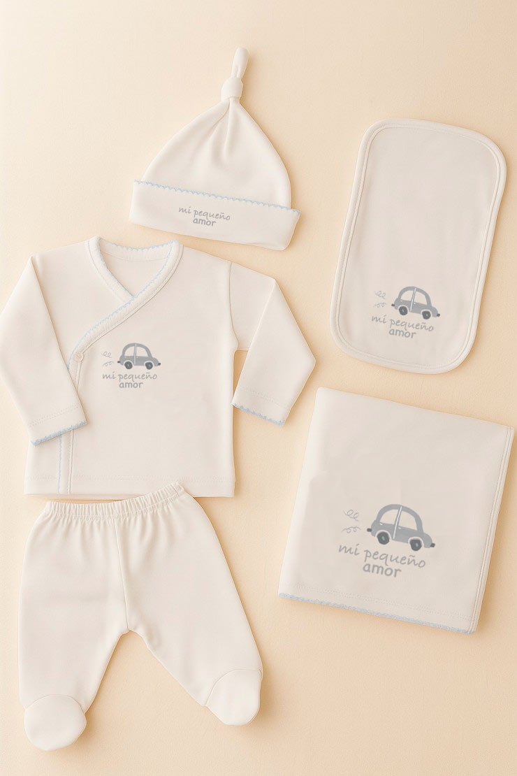 Set de nacimiento "MI PEQUEÑO AMOR": Contiene batita, ranita, manta, babita y gorro. Fabricado en algodón pima, suave y cómodo, con terminación en picot y estampa "OSITO". ORIGEN: NACIONAL.