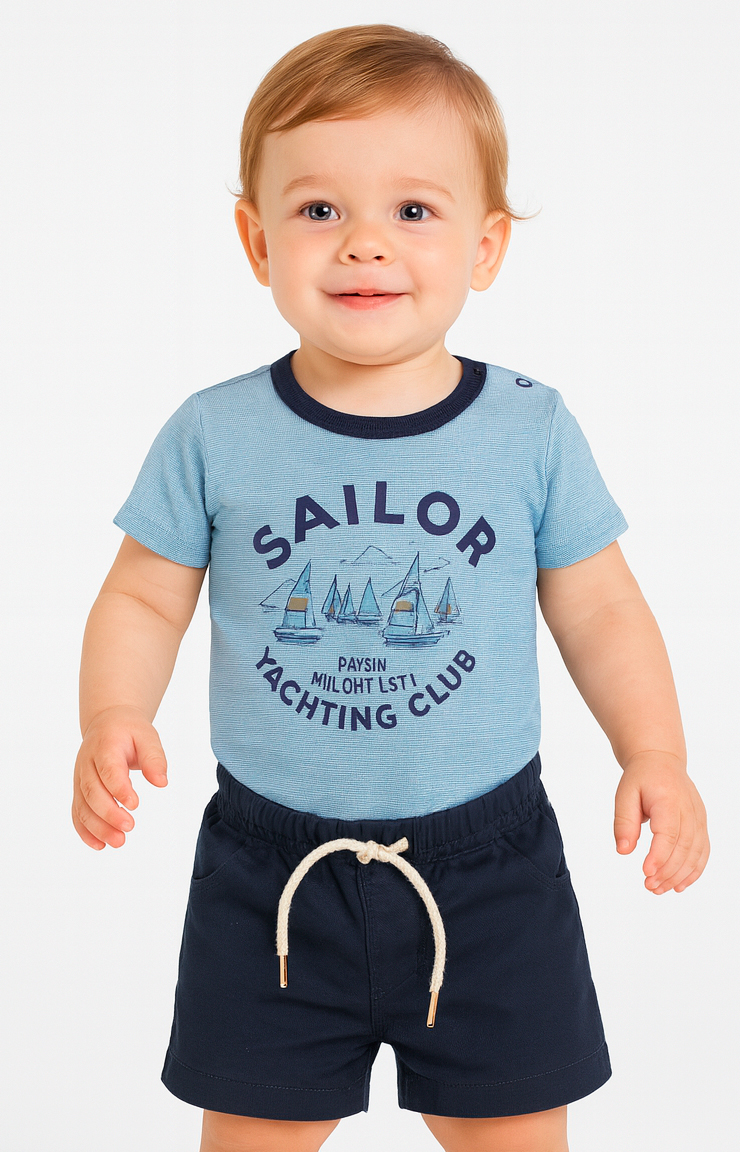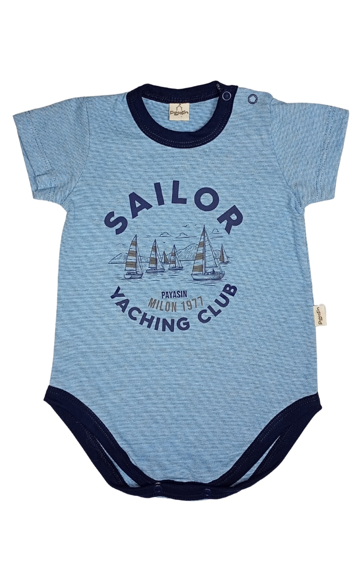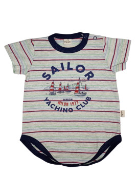 Body manga corta de jersey rayado , material suave, 100% algodón, brindando confort y comodidad para la piel de tu bebé. La delantera lleva estampa /SAILOR/, tiene apertura en hombro y broches en piernas que permite comodidad a la hora del cambio.Origen: NACIONAL.