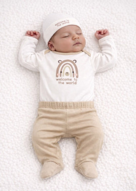 Set mediano de ribb,compuesto por body, ranita, gorro y babita. Ranita lleva elástico en la cintura para una mayor comodidad a la hora del cambio, su gorrito y babita es un complemento importante para los más bebés al momento de abrigarse, y su body tiene escote base y abertura en hombro con broche. Este set es muy práctico y cómodo brindándole un confort absoluto a la piel de los bebés. Origen: NACIONAL.
