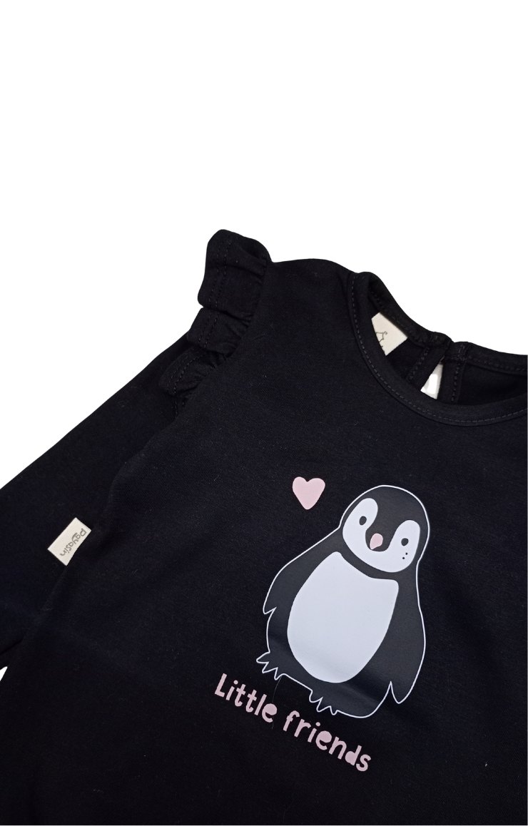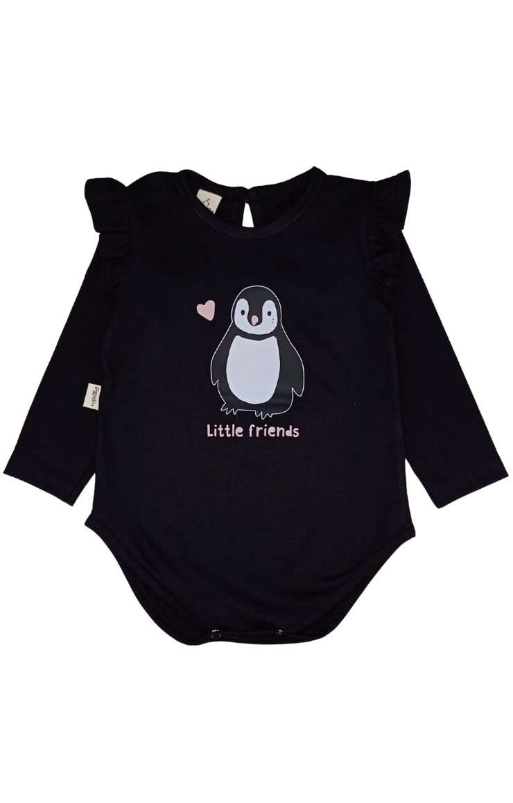 Body M-L de jersey, su material con una textura suave y flexible asegura confort a la hora de vestir la prenda. La apertura en espalda con botón práctico y fácil al momento del cambio. Delantera con estampa /WENDY/ Tiene voladitos con pequeños frunces en los hombros. Origen: NACIONAL